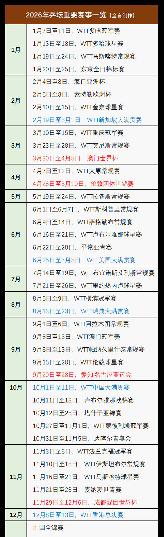 与此同时,WTT冠军赛的几站赛事也不可忽略,分别为1月7日至11日多哈站、3月10日至15日重庆站、8月5日至9日横滨站、9月8日至13日澳门站、10月27日至11月1日蒙彼利埃站及11月3日至8日法兰克福站。尽管积分低于大满贯,但对选手排名和市场价值发挥积极作用。随后12月8日至13日在香港举行的WTT总决赛,将成为2026国际乒坛的压轴大戏。