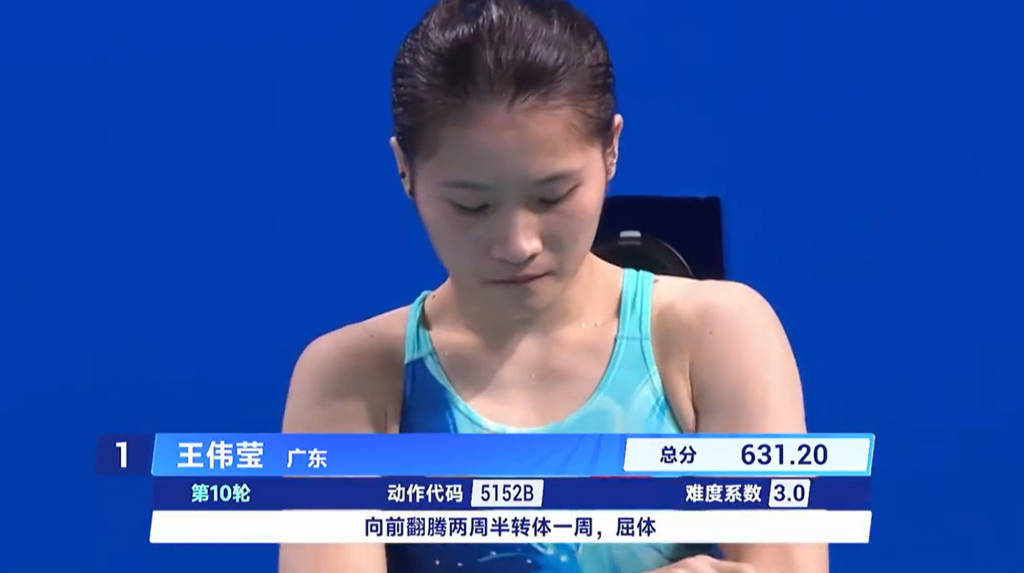 跳水项目开赛首日,王伟莹先是在女子团体10米跳台比赛中位列榜首,后又与全红婵搭档拿下女子团体双人10米跳台比赛第一,助力广东队收获跳水女子团体项目金牌。